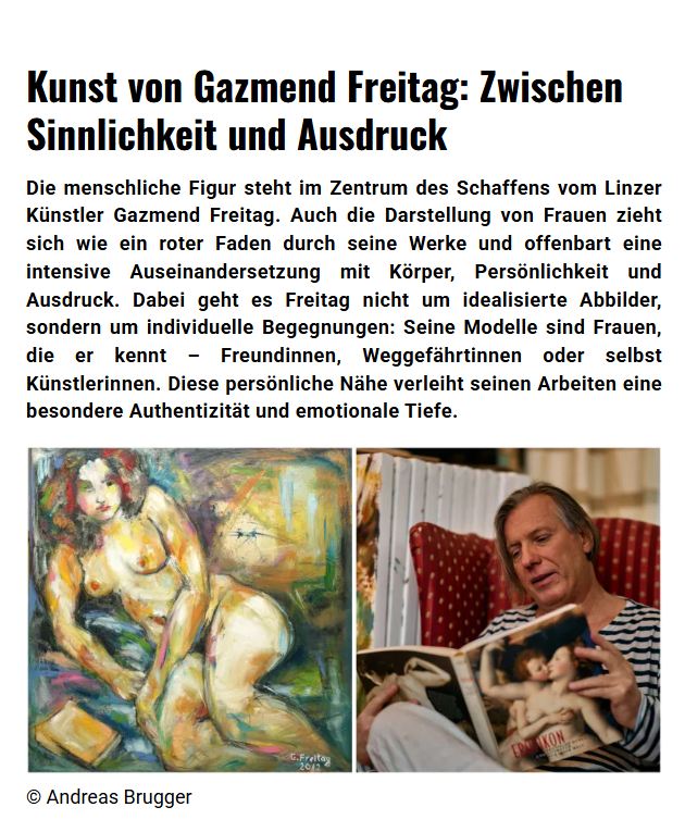 Die Arbeiten von Gazmend Freitag beinhalten darüber hinaus noch zahlreiche andere Motive: autobiografische Elemente, Landschaften des Geburtsortes (Pataqani i Poshtem), zahlreiche Porträts von Menschen, Erinnerungen aus der Kindheit, Aktstudien, Stillleben und vieles mehr. Sein Talent setzt er sehr vielseitig in verschiedenen Techniken wie Grafik, Ölmalerei, Zeichnung mit Bleistift, Kreide und Tusche, um. Die Werke von Gazmend Freitag zeugen von der seelischen Feinfühligkeit eines überaus ambitionierten Künstlers, den es schon seit seiner Kindheit drängt, zu zeichnen und zu malen. In seiner neuen Heimat Linz ist er nicht nur erfolgreich als Künstler tätig und kann auf eine Reihe von internationalen Ausstellungen verweisen, sondern pflegt auch einen regen Kontakt und Austausch mit anderen Künstlerinnen und Künstlern." Ursula Pfeiffer kunst-projekte