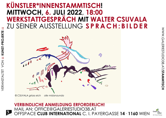 6. Juli Werkstattgespräch mit Walter Csuvala zu seiner Ausstellung S P R A C H : B I L D E R im C.I. EINLADUNG als PDF