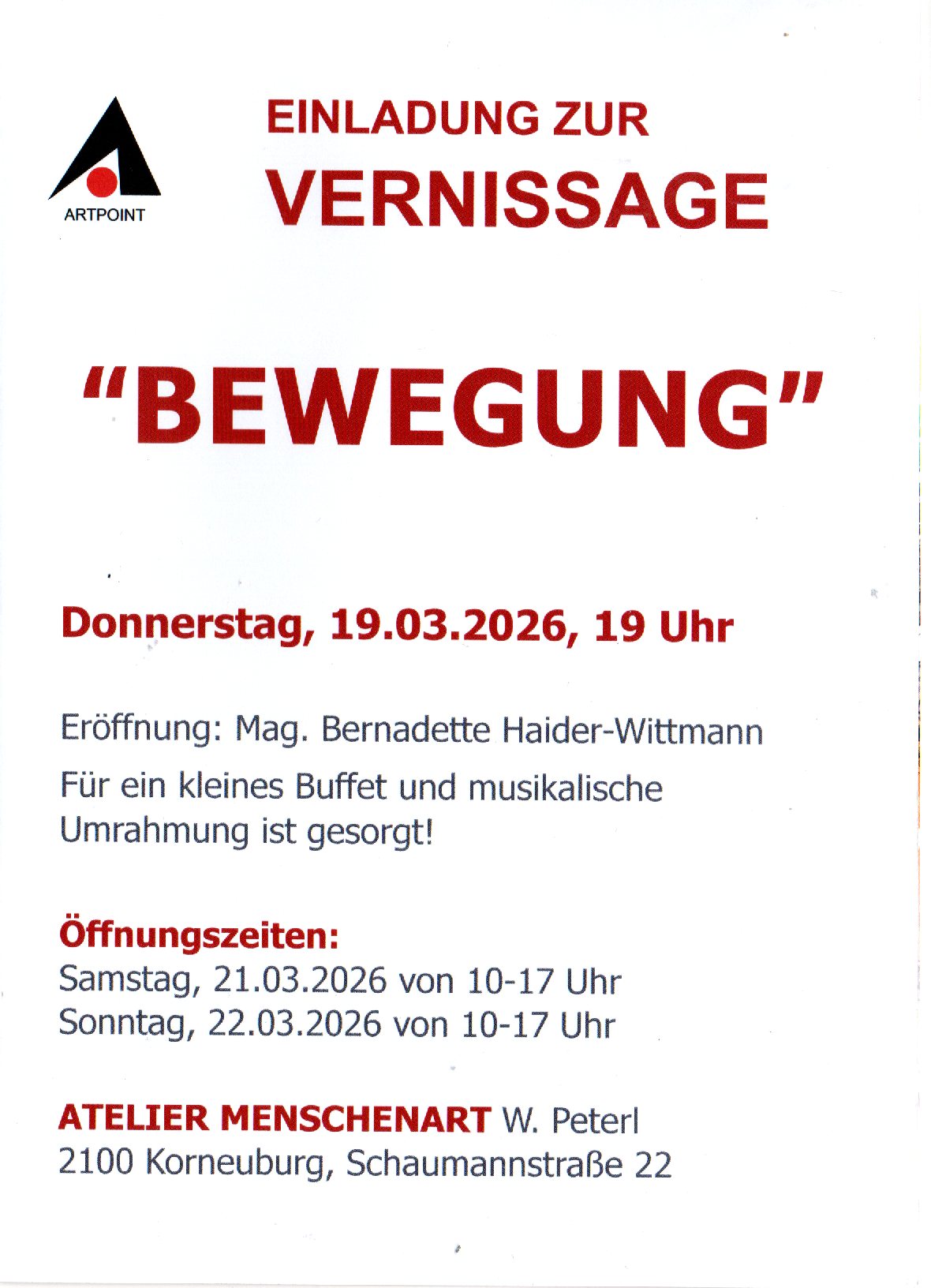19. - 22. März "Bewegung", Korneuburg, Atelier Menschenart, Schaumannstraße 22