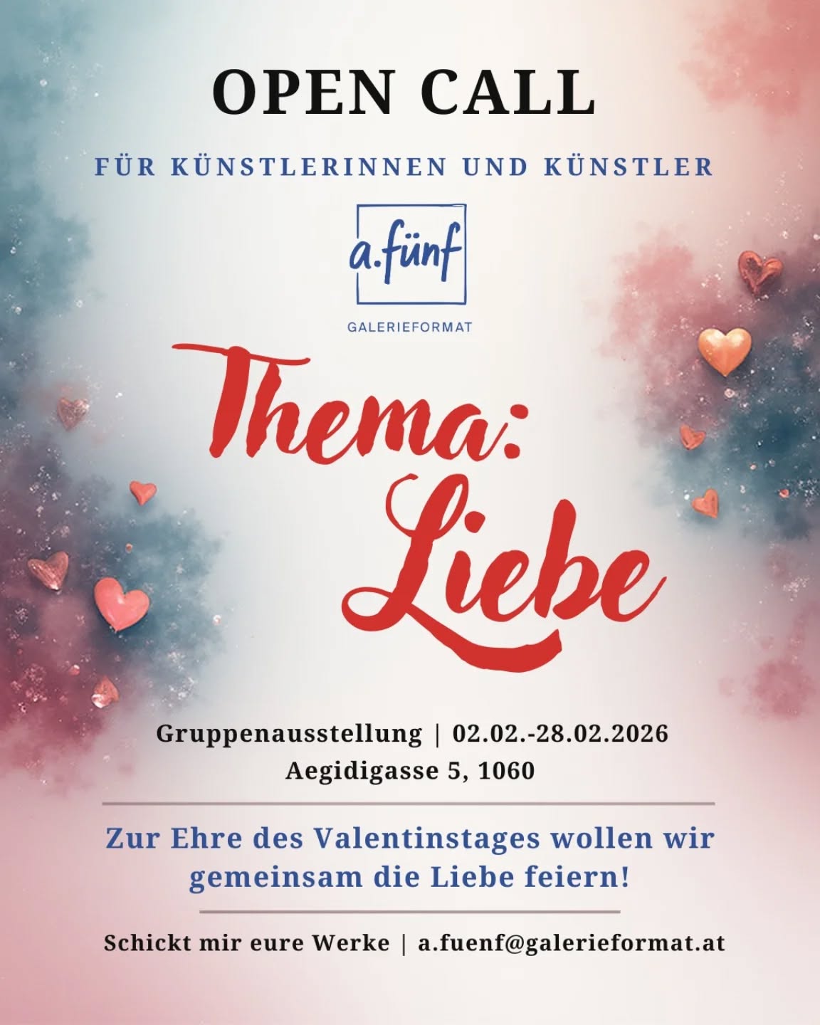 Willkommen sind alle Werke zum Thema Liebe, die an Wände mit Galerieschienen gehängt werden können (bitte darauf bereits vor Anlieferung achten. Bilder, die nicht mit tauglicher Aufhängung ausgestattet sind am Tag der Anlieferung, werden ausnahmslos ausgeschlossen)
