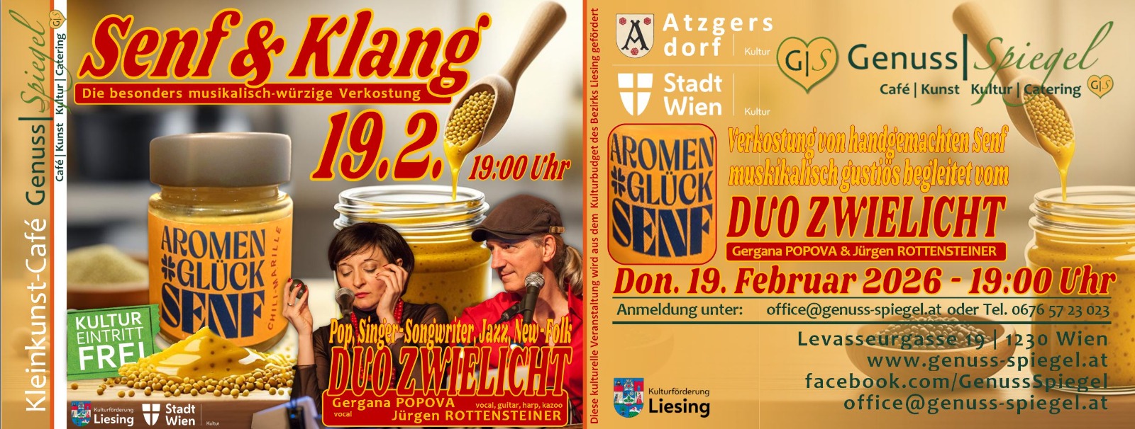 Donnerstag, 19. Februar, 19 Uhr Senf und Klang Genussspiegel Atzgersdorf Levasseurgasse 19, 1230 Wien
