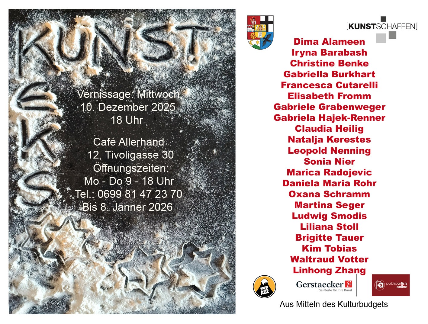 Ab Mittwoch, 10. Dezember - 8. Jänner 2026 Ausstellungsbeteiligung Cafe Allerhand Tivoligasse 30, 1120 Wien
