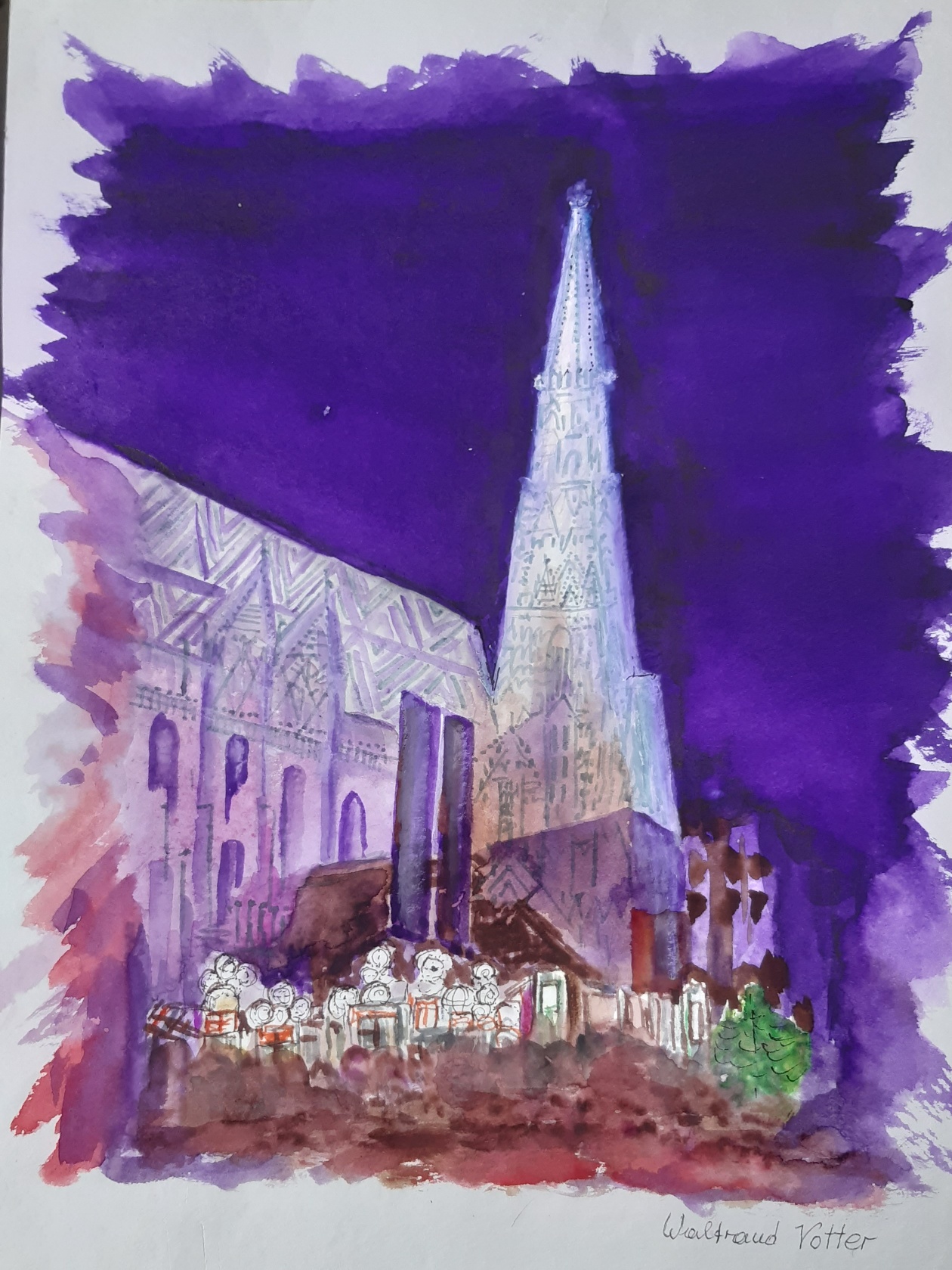 Weihnachtsmarkt vor dem Stephansdom. Aquarell 30x40 cm