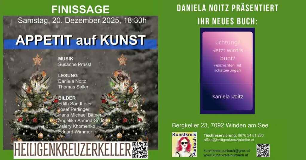 8. Juli 57. Kellertexte Alberts Bücherlager, Aichholzgasse 19, 1120 Wien 19. Juni Alte Meister neu interpretiert Amtshaus Margareten Schönbrunner Straße 54, 1050 Wien 14. Juni "Was mich bewegt... Literatur im Park" Alois Drasche Park, 1040 Wien 3. Juni 56. Kellertexte Alberts Bücherlager, Aichholzgasse 19, 1120 Wien 3. und 4. Mai Teilnahme beim Galerienrundgang 2024 Alberts Bücherlager Aichholzgasse 19, 1120 Wien FOLDER als PDF 3. Mai 55. Kellertexte Alberts Bücherlager, Aichholzgasse 19, 1120 Wien Eventfotos auf fb 15. April 54. Kellertexte Alberts Bücherlager, Aichholzgasse 19, 1120 Wien 12. April Lesung "Die 12 Apostel" bei der Vernissage "12 Apostel 2" von Alfred Haslinger SICHTBAR WERDEN Veranstaltungszentrum Reindorfgasse 22, 1150 WienEINLADUNG und PLAKAT als PDF