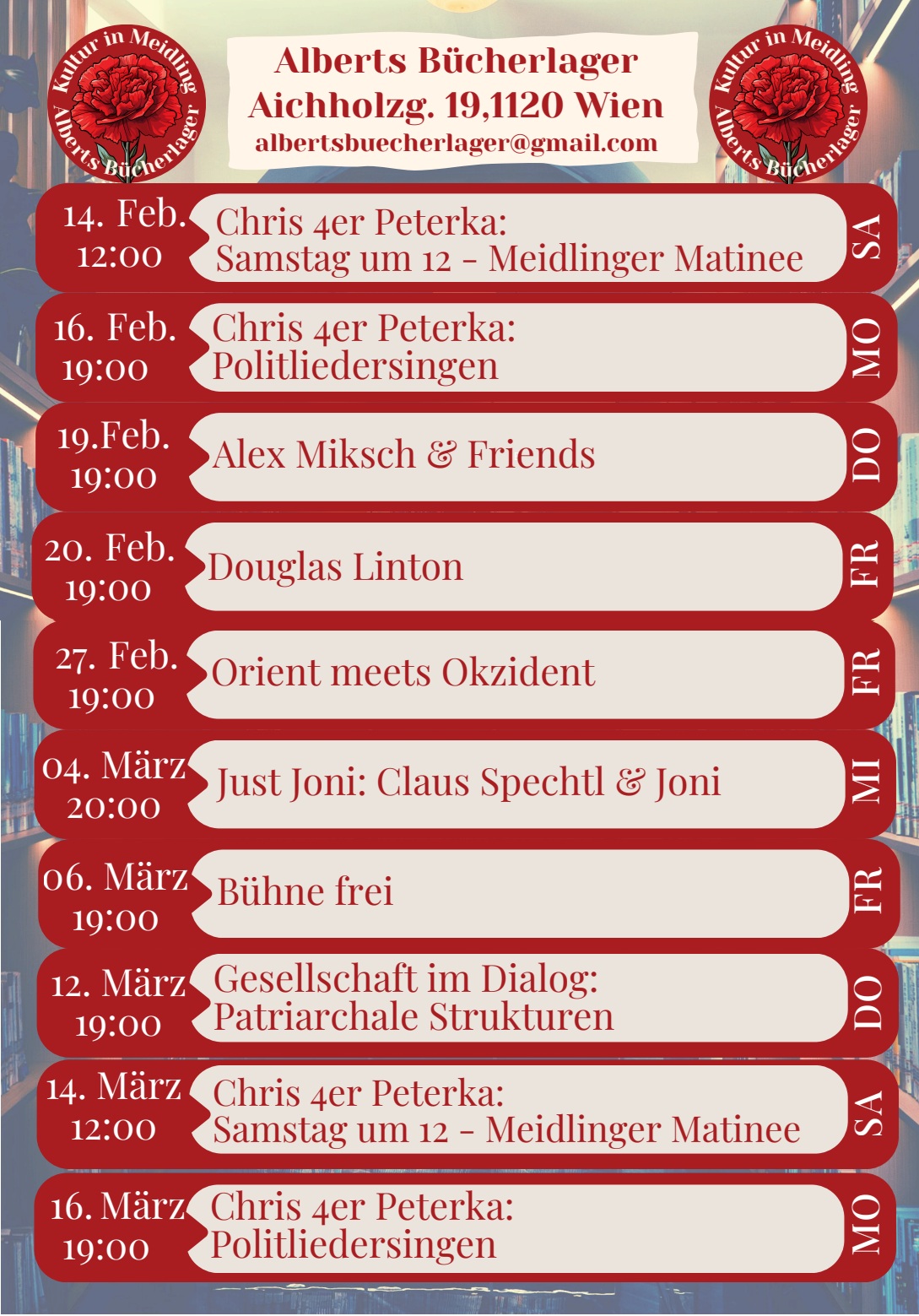 8. Juli 57. Kellertexte Alberts Bücherlager, Aichholzgasse 19, 1120 Wien 19. Juni Alte Meister neu interpretiert Amtshaus Margareten Schönbrunner Straße 54, 1050 Wien 14. Juni "Was mich bewegt... Literatur im Park" Alois Drasche Park, 1040 Wien 3. Juni 56. Kellertexte Alberts Bücherlager, Aichholzgasse 19, 1120 Wien 3. und 4. Mai Teilnahme beim Galerienrundgang 2024 Alberts Bücherlager Aichholzgasse 19, 1120 Wien FOLDER als PDF 3. Mai 55. Kellertexte Alberts Bücherlager, Aichholzgasse 19, 1120 Wien Eventfotos auf fb 15. April 54. Kellertexte Alberts Bücherlager, Aichholzgasse 19, 1120 Wien 12. April Lesung "Die 12 Apostel" bei der Vernissage "12 Apostel 2" von Alfred Haslinger SICHTBAR WERDEN Veranstaltungszentrum Reindorfgasse 22, 1150 WienEINLADUNG und PLAKAT als PDF